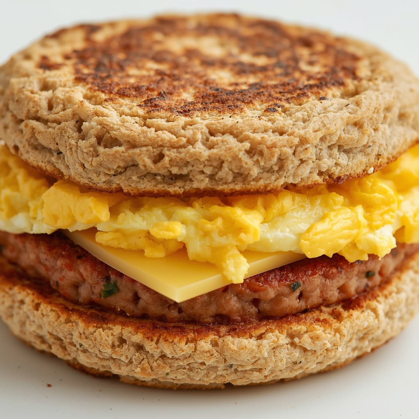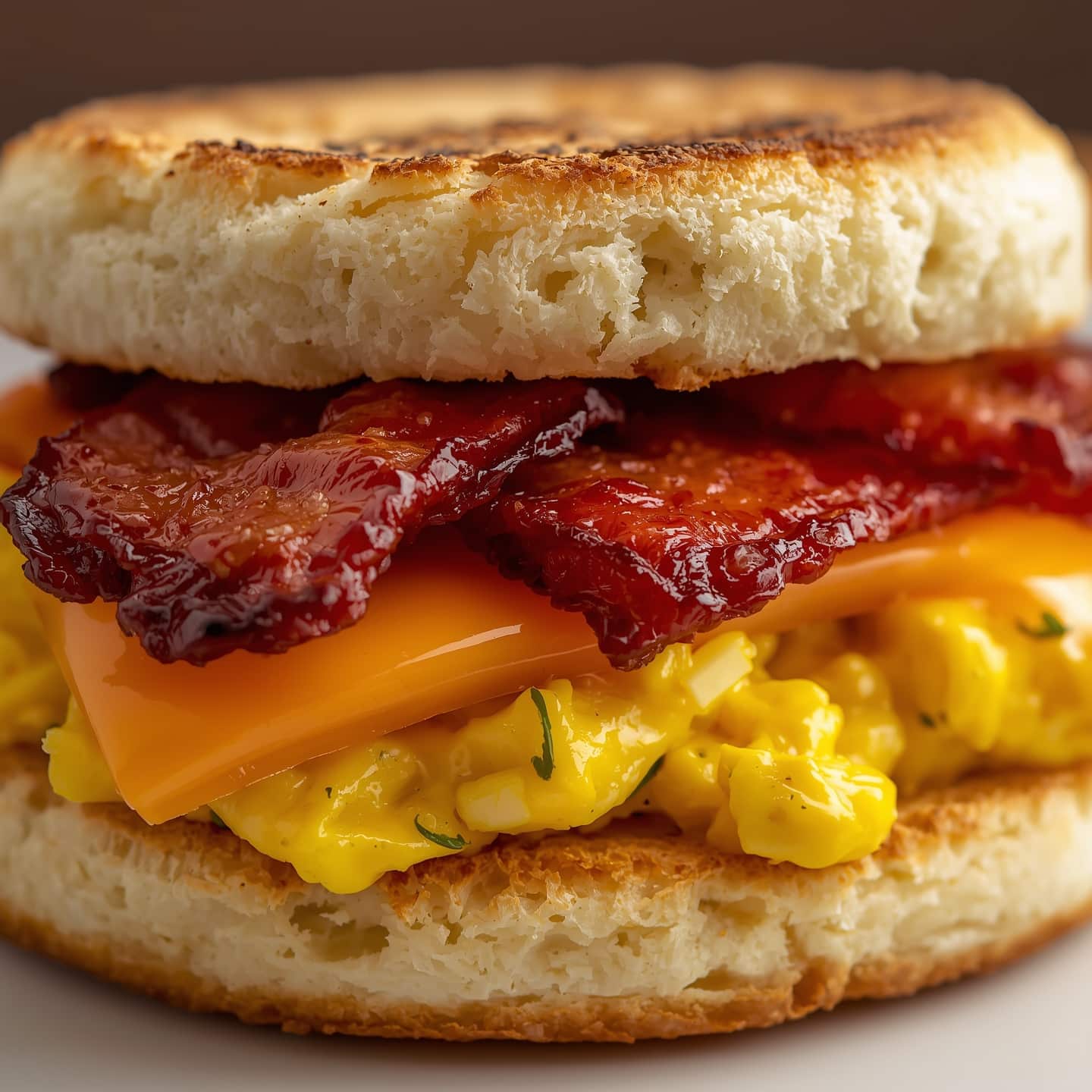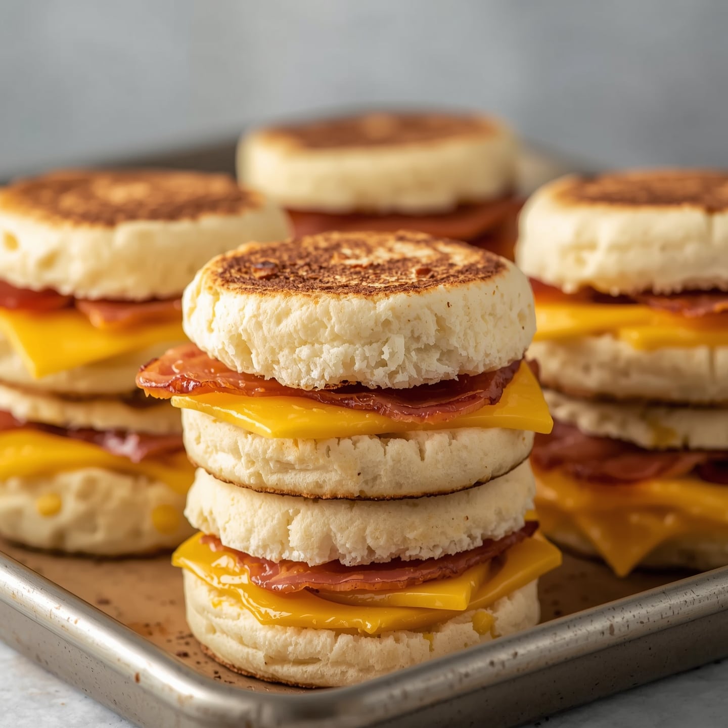 - Layer the eggs, cheese, and bacon or sausage between the muffin halves.