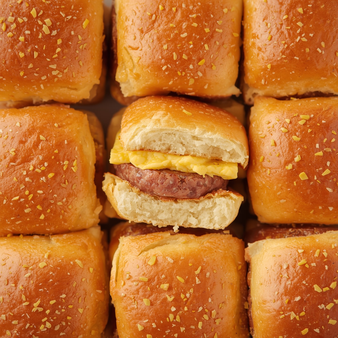 - Slice your Hawaiian rolls, then stack the sausage, eggs, and cheese inside.