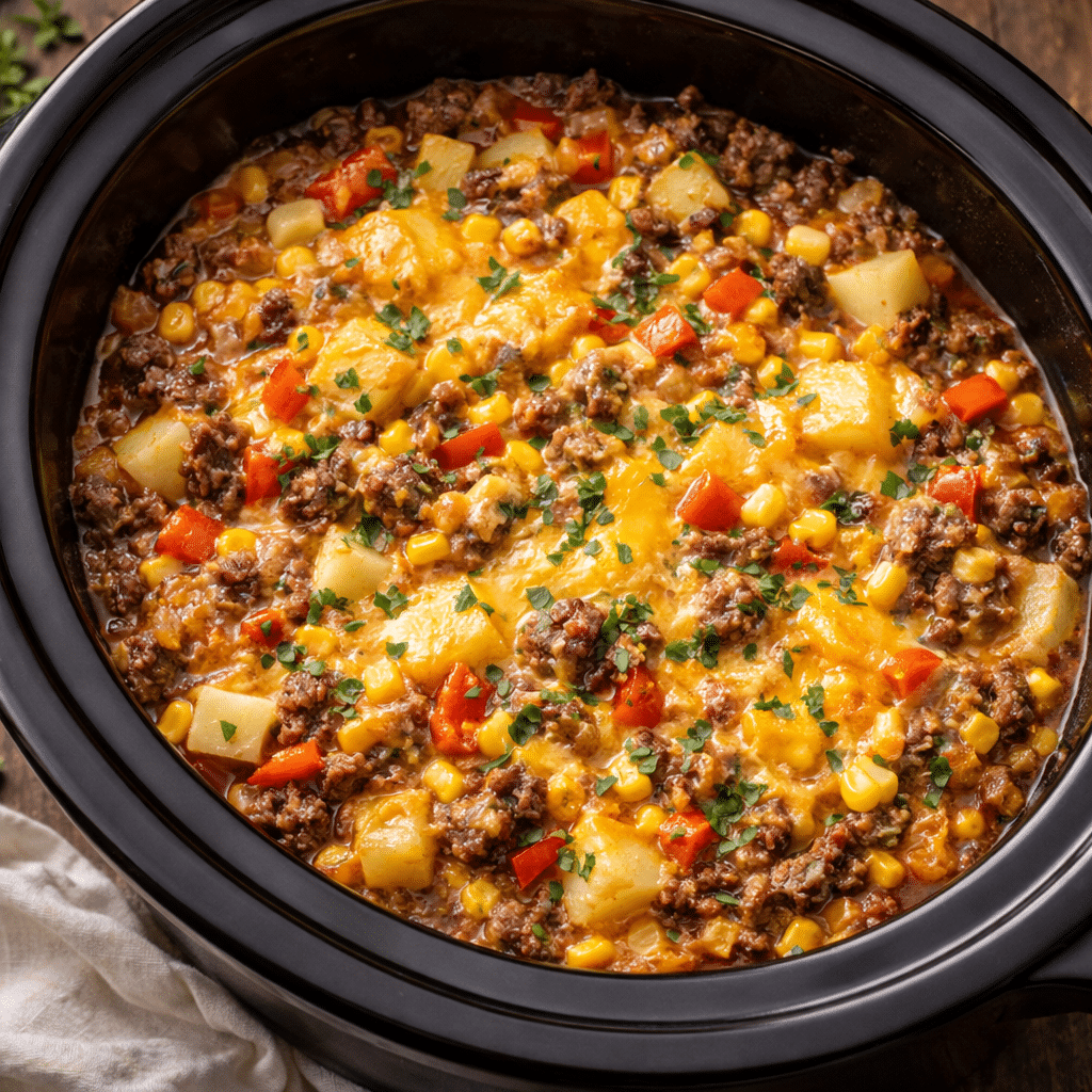 - Layer potatoes, beef, corn.