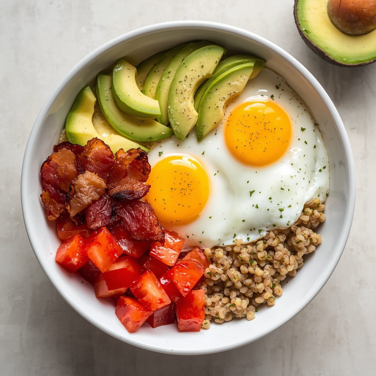 - Assemble your bowl with quinoa, bacon, avocado, and tomatoes.