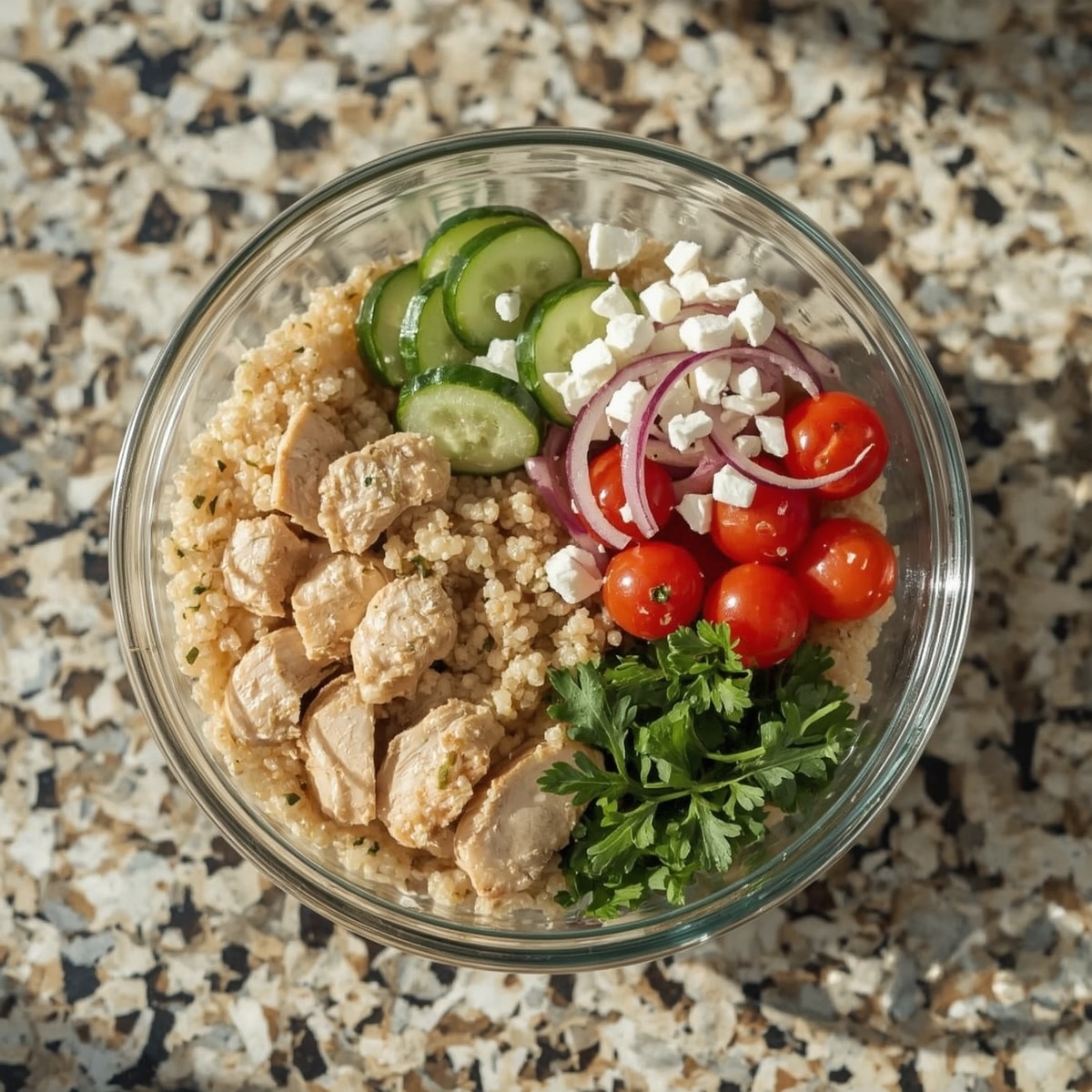 This bowl is bright, clean, and perfect for Meal Prep For Work. The chicken stays juicy, the quinoa adds a nutty bite, and the cucumber-tomato mix keeps everything fresh.