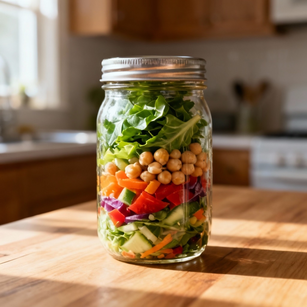 Layer everything in a jar—dressing first, hearty veggies next, grains and beans in the middle, greens on top. Seal it and feel superior.